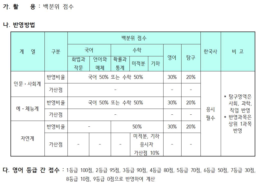 2. 수능 반영방법(정원내 및 정원외 전형 공통)