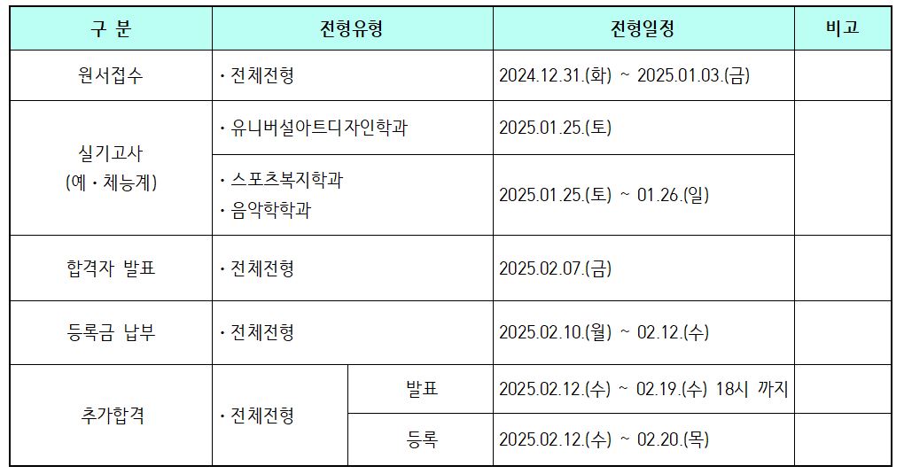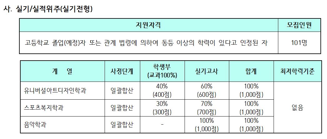 실기/실적위주(실기전형)은 유니버설아트디자인학과의 경우 학생부(교과100%) 40% + 실기 60%로, 스포츠복지학과는 학생부(교과100%) 30% + 실기 70%로, 음악학과는 실기 100%로 학생을 모집할 예정입니다.
