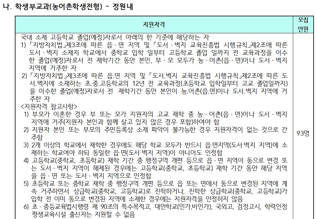 학생부교과(농어촌학생전형) 에서는 93명을 모집할 예정이며, 학생부(교과 100%)로 학생을 선발합니다.