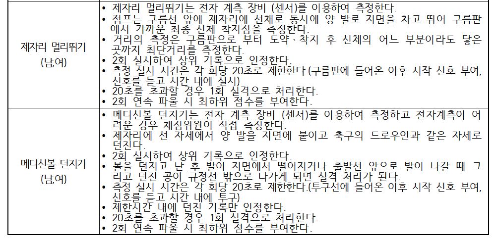 실기 종목은 10m 왕복달리기, 제자리 멀리뛰기, 메디신볼 던지기이며 자세한 실시 방법은 위와 같습니다.
