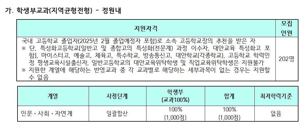 학생부교과(지역균형전형)으로는 202명의 학생을 모집할 예정이며, 학생부(교과100%)로 학생을 모집합니다.