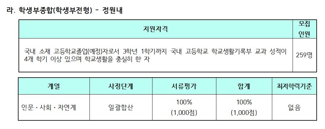 학생부종합(학생부전형)에서는 259명을 모집할 예정이며, 서류평가 100%로 학생을 모집합니다.