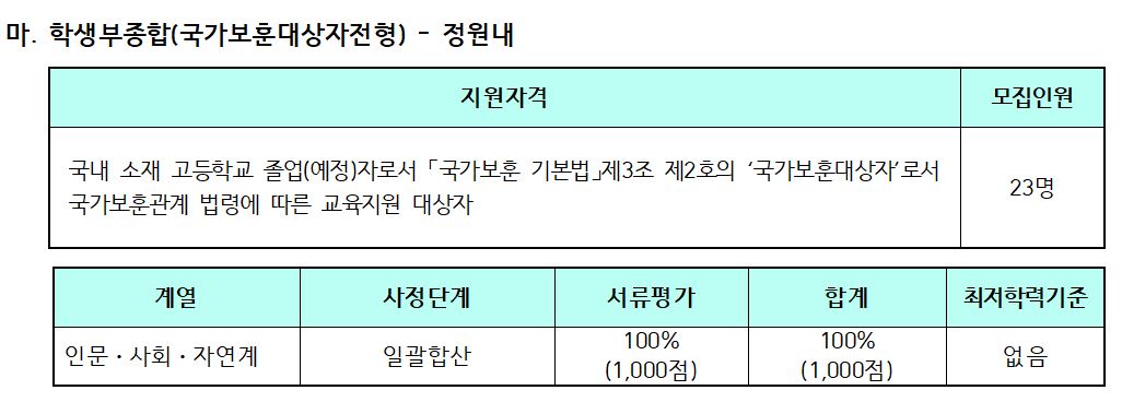 학생부종합(국가보훈대상자전형)에서는 23명을 모집할 예정이며, 서류평가 100%로 학생을 모집합니다.