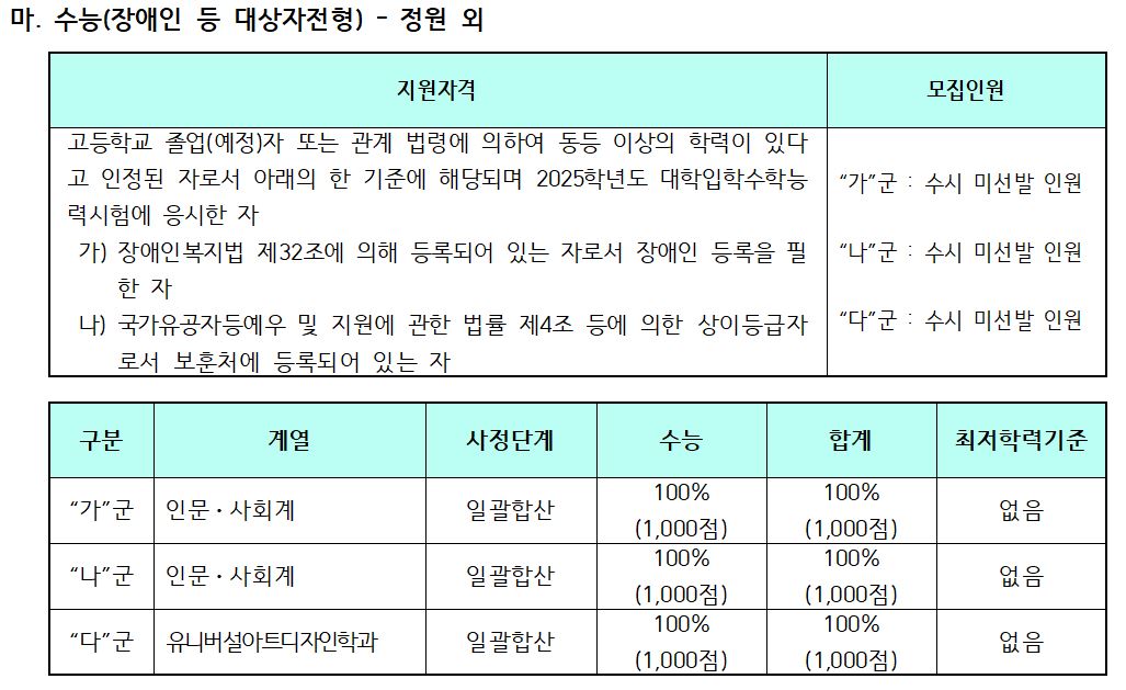정원 외 전형에서는 학생부종합(장애인 등 대상자전형)이 1단계에서 서류 100%로 3배수를 모집하며, 2단계는 1단ㄱ녜 점수 70% + 면접 30%로 학생을 모집할 예정입니다.