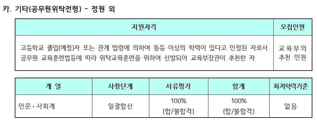 기타(공무원위탁전형) - 정원외에서는 교육부의 추천 인원에 맞춰 모집을 할 예정이며, 서류평가 100%로 학생을 모집할 예정입니다.