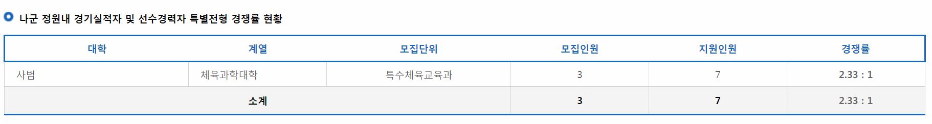나군 정원내 경기실적자 및 선수경력자 특별전형에서는 특수체육교육과의 신입생을 모집했으며, 경쟁률은 2.33:1 이었습니다.