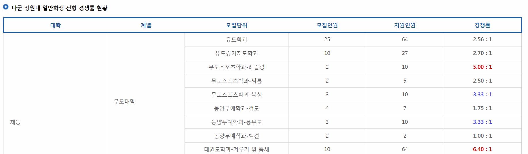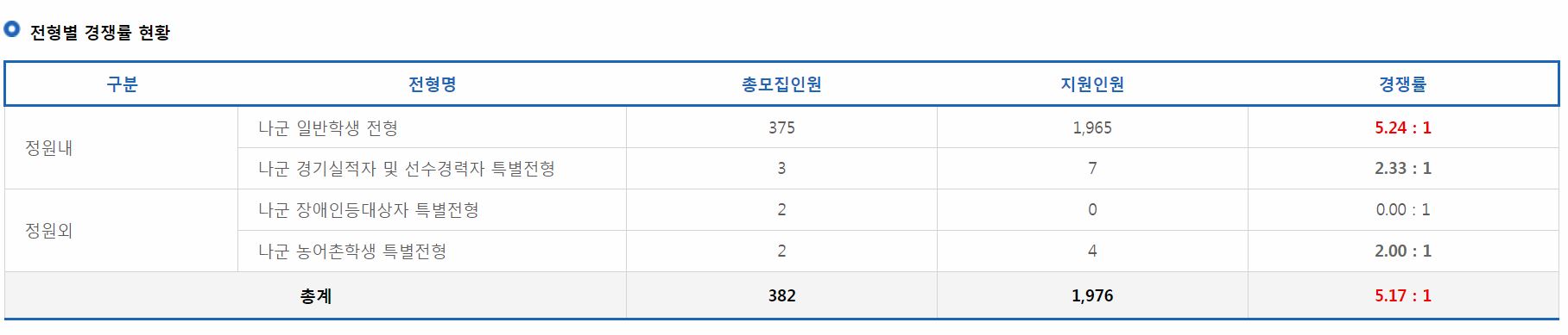 나군 정원내 경기실적자 및 선수경력자 특별전형 경쟁률 현황