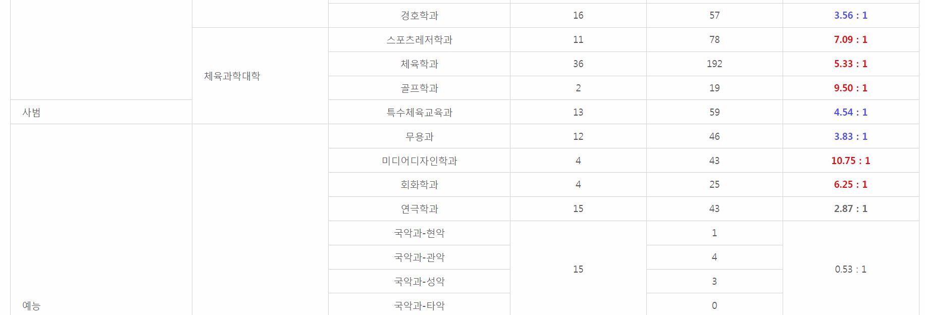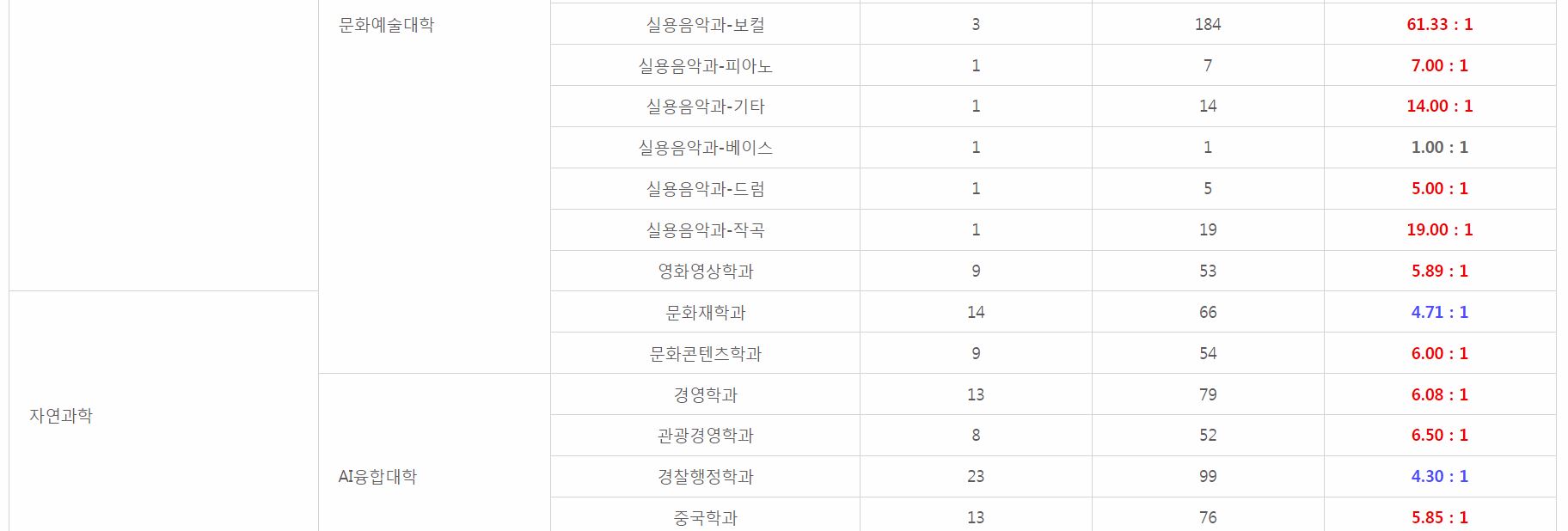 나군 정원내 일반학생 전형의 국악과는 미달, 실용음악과-베이스는 모집인원과 지원인원이 같았으며, 이외의 학과 중 가장 경쟁률이 높았던 학과는 실용음악과-보컬(61.33:1), 실용음악과-작곡(19.00:1), 실용음악과-기타(14.00:1) 순이었습니다.