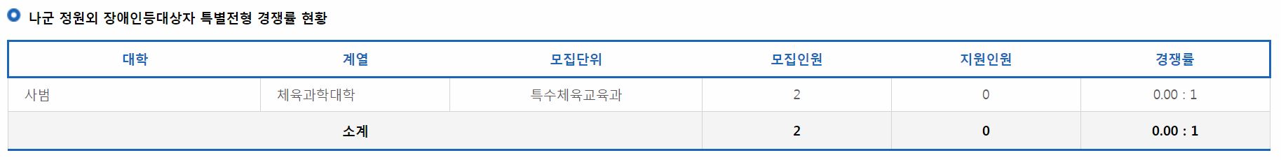 나군 정원외 장애인등대상자 특별전형에서는 특수체육교육과의 신입생을 모집했으며, 미달이었습니다.