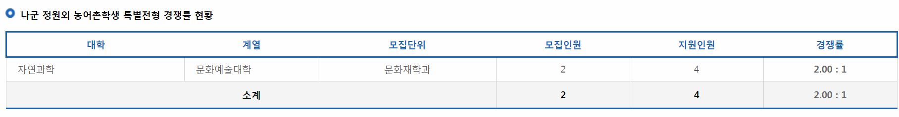 나군 정원외 농어촌학생 특별전형에서는 문화재학과의 신입생을 모집했으며, 경쟁률은 2.00:1 이었습니다.