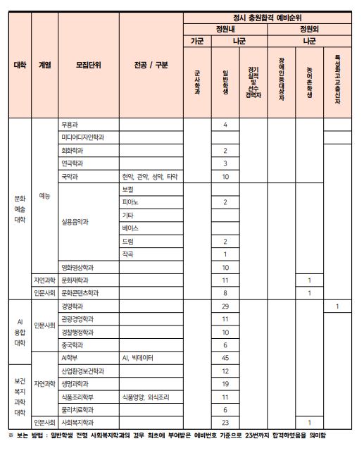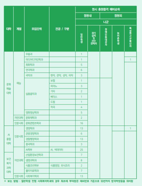 | [4년제/전라북도 임실군/경기도 양주시] 2024학년도 예원예술대학교 작년(2023년) 정시 등급 (0) | 2024.01.13 |
