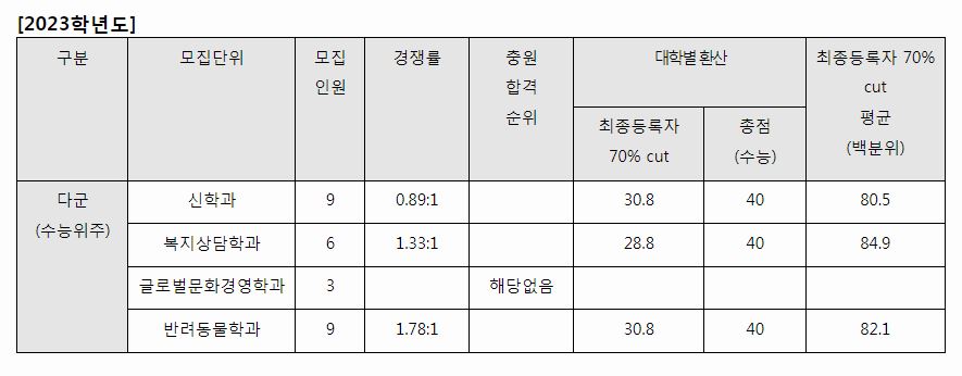 원래 3개년 정시 등급을 업로드하지만, 칼빈대학교는 작년 정시 등급만을 공개하고 있기에 2023학년도 정보만을 업로드하도록 하겠습니다.