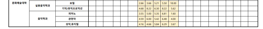 다군 : 커뮤니케이션디자인학과, 실용음악학과(보컬), 실용음악학과(기악/뮤직프로덕션), 음악학과(피아노), 음악학과(관현악), 음악학과(성악, 뮤지컬)