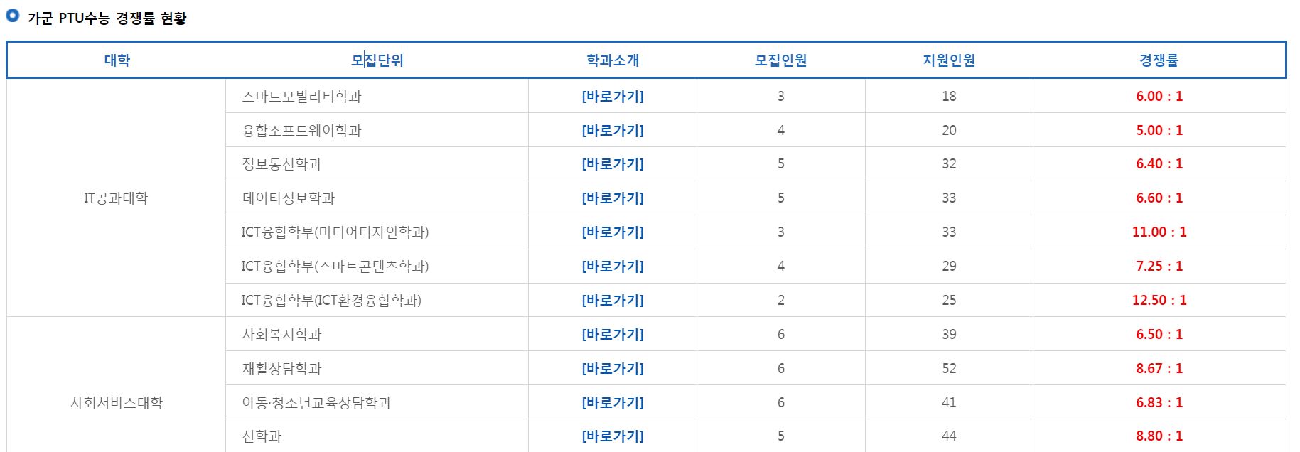 가군 PTU수능에서 가장 경쟁률이 높았던 학과는 ICT융합학부(ICT환경융합학과)(12.50:1), ICT융합학부(미디어디자인학과)(11.00:1), 신학과(8.80:1) 순이었습니다.
