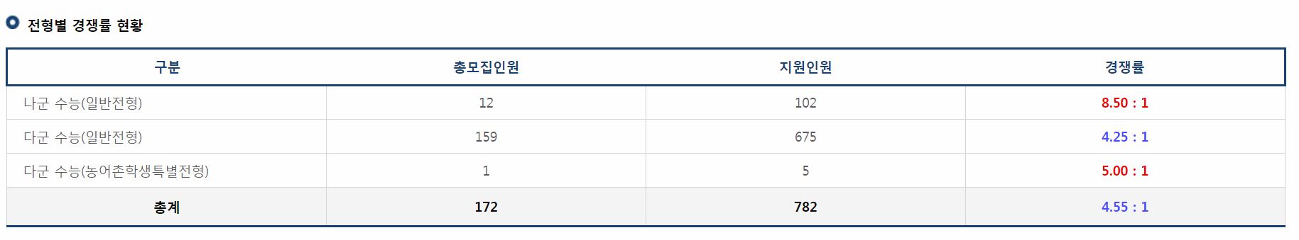 전형별 경쟁률을 살펴보자면, 나군 수능(일반전형)의 경쟁률은 8.50:1, 다군 수능(일반전형)의 경쟁률은 4.25:1, 다군 수능(농어촌학생특별전형)의 경쟁률은 5.00:1 이었습니다.