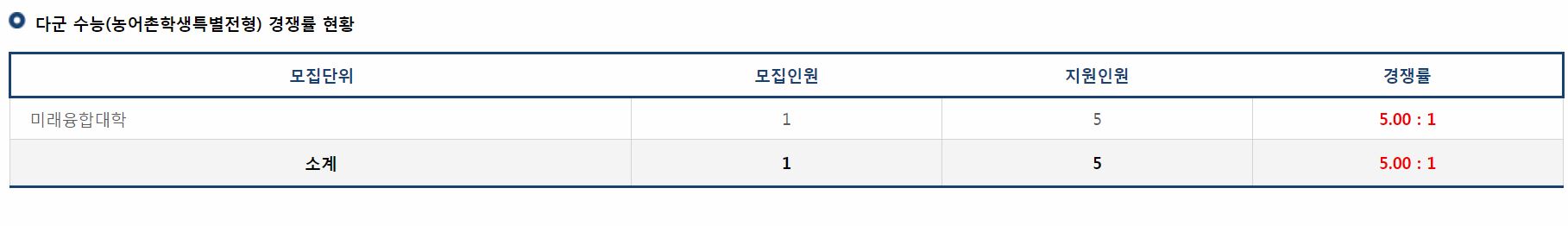 다군 수능(농어촌학생전형)에서는 미래융합대학의 신입생을 모집했으며, 경쟁률은 5.00:1 이었습니다.