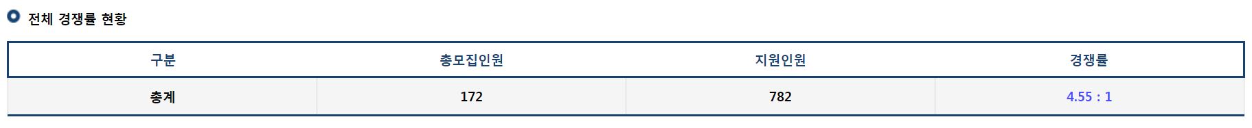 전체 경쟁률 현황을 먼저 살펴보겠습니다. 모든 전형을 통틀어 올해 차의과학대학교의 정시 경쟁률은 4.55:1 이었습니다.