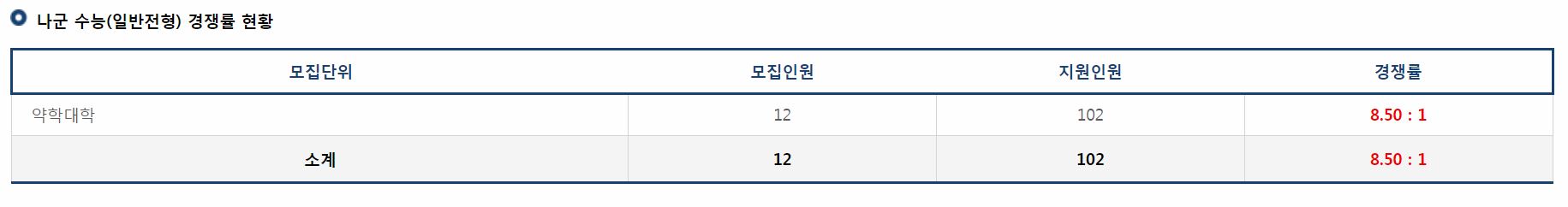 나군 수능(일반전형)에서는 약학대학의 신입생을 모집했으며, 경쟁률은 8.50:1 이었습니다.