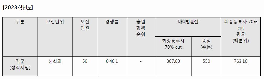 원래 3개년 정시 등급을 올리지만, 수원가톨릭대학교는 작년 정시 등급만 공개하고 있기에 2023학년도 정보만 포스팅하도록 하겠습니다.