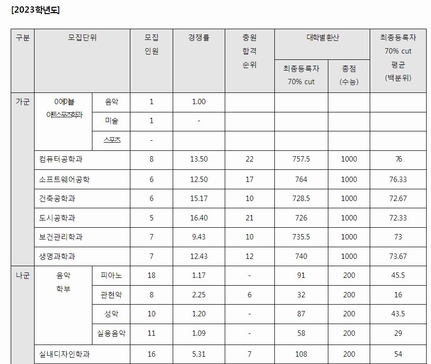 가군 : 컴퓨터공학과, 소프트웨어공학과, 건축공학과, 도시공학과, 보건관리학과, 생명과학과