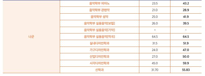 나군 : 음악학부 피아노, 음악학부 관현악, 음악학부 성악, 음악학부 실용음악[보컬], 음악학부 실용음악[기악], 음악학부 실용음악[작곡], 실내디자인학과, 가구디자인학과, 산업디자인학과, 시각디자인학과, 신학과