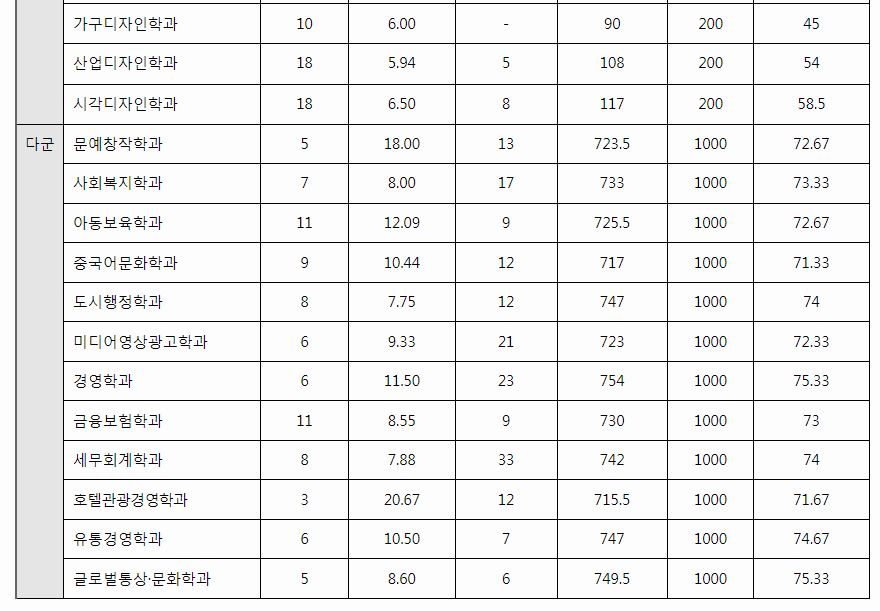 다군 : 문예창작학과, 사회복지학과, 아동보육학과, 중국어문화학과, 도시행정학과, 미디어영상광고학과, 경영학과, 금융보험학과, 세무회계학과, 호텔관광경영학과, 유통경영학과, 글로벌통상문화학과