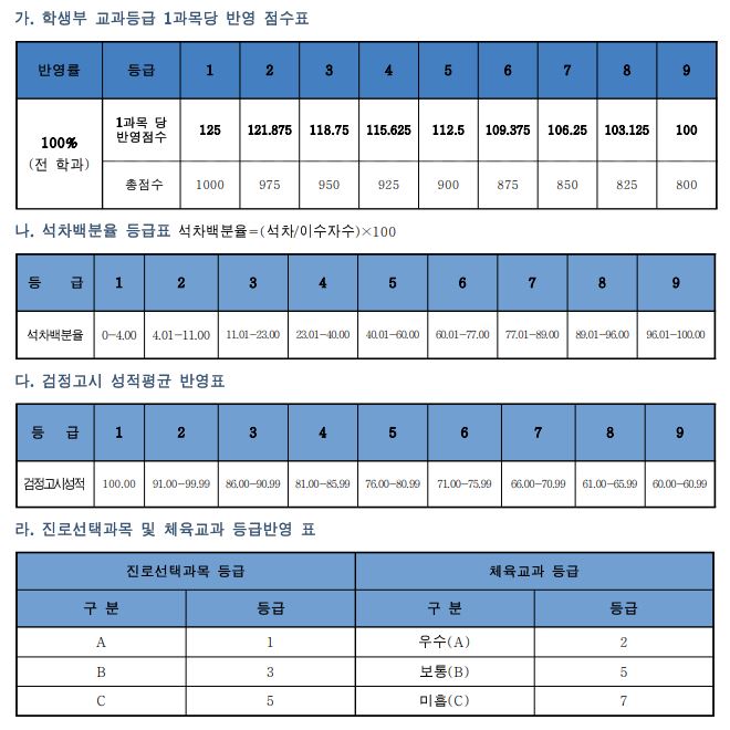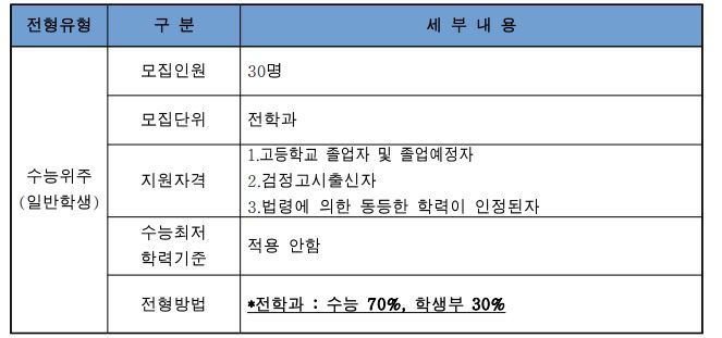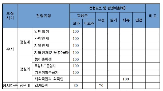 정원외 전형의 재외국민과 외국인, 정시다군 일반학생 전형을 제외하고는 모두 학생부교과 100%로 학생을 선발하며, 정원외 재외국민과 외국인 전형은 서류 100%, 정시다군 일반학생 전형은 학생부 교과 30% + 수능 70% 로 학생을 선발합니다.