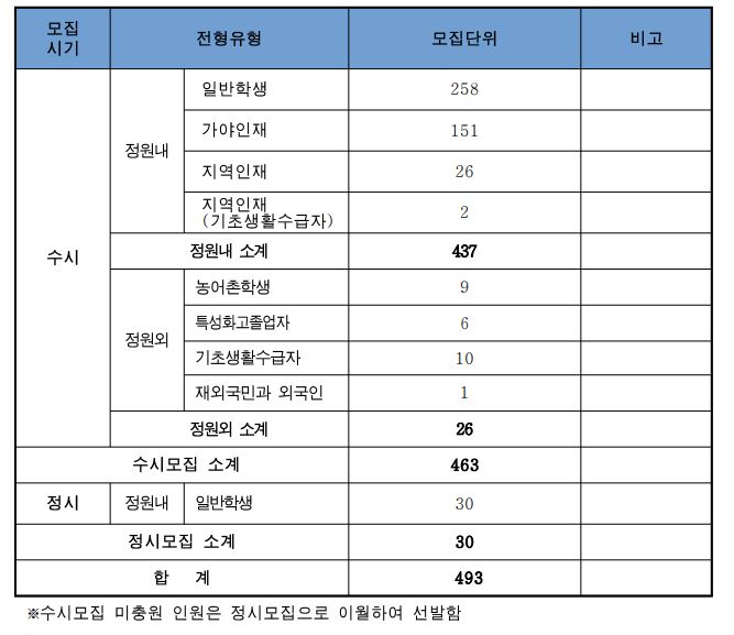 가야대학교의 올해 주요 변경 사항은 다음과 같습니다. 입학 정원과 모집 인원은 각각 460, 493명으로 작년과 동일합니다. 모집 시기별 인원은 살짝 차이가 있는데요, 수시 모집 인원이 한 명 늘고, 정시 모집 인원이 한 명 줄었습니다.