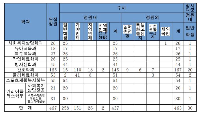 모집 학과는 사회복지상담학과, 유아교육과, 특수교육과, 작업치료학과, 방사선학과, 간호학과, 물리치료학과, 스포츠재활복지학부, 커리어플러스학부(사회복지상담전공), 커리어플러스학부(부동산금융재테크전공, 헬스케어전공)입니다.