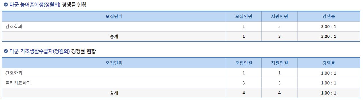 농어촌학생(정원외) 전형에서 간호학과 경쟁률은 3.00:1이었으며, 기초생활수급자(정원외) 전형에서는 간호학과와 물리치료학과의 모집인원과 지원인원이 같았습니다.