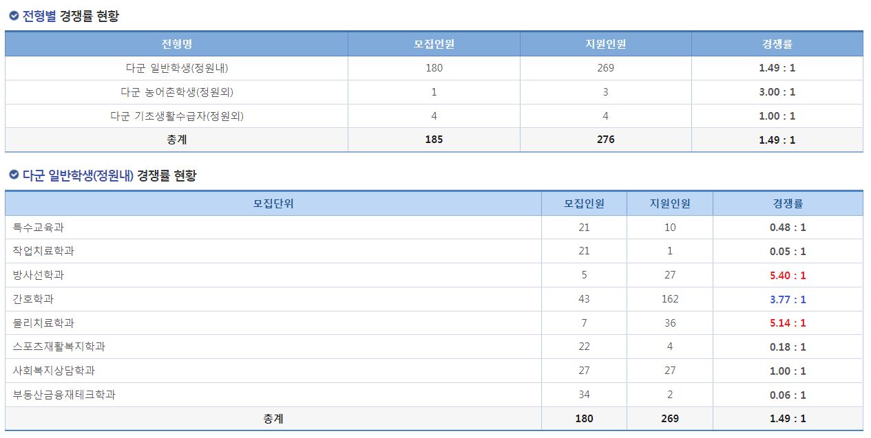 일반학생(정원내)에서는 특수교육과, 작업치료학과, 스포츠재활복지학과, 부동산금융재테크학과는 미달이었으며, 사회복지상담학과는 모집인ㅇ눤과 지원인원이 같았습니다. 이외의 학과 중 가장 경쟁률이 높았던 학과는 방사선학과(5.40:1), 물리치료학과(5.14:1), 간호학과(3.77:1) 순이었습니다.