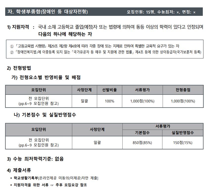 학생부종합의 경우 사회대, 사범대, 수의대, 의과대, 간호대, 약학대를 제외하고는 서류 100%로 학생을 선발하며, 상기한 학과들은 1단계에서 서류평가 100%로 학생을 3배수 선발하고 (약학대의 경우 5배수), 2단계에서 서류 80%에 면접 20%를 반영하여 학생을 선발합니다.