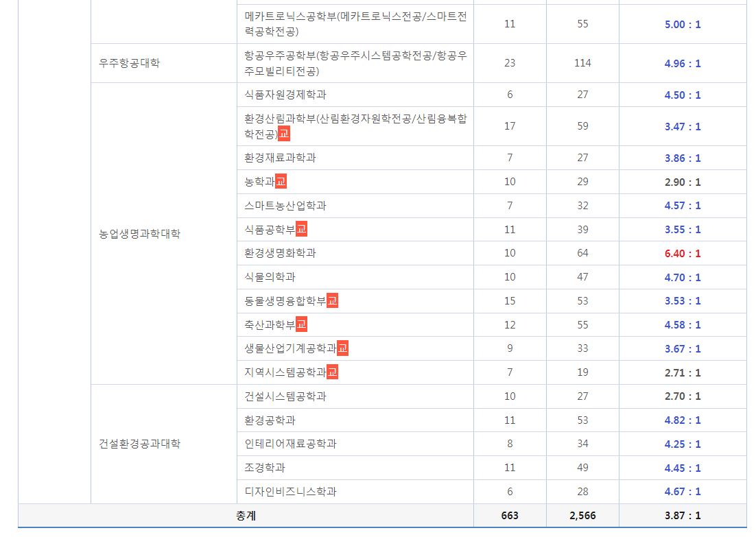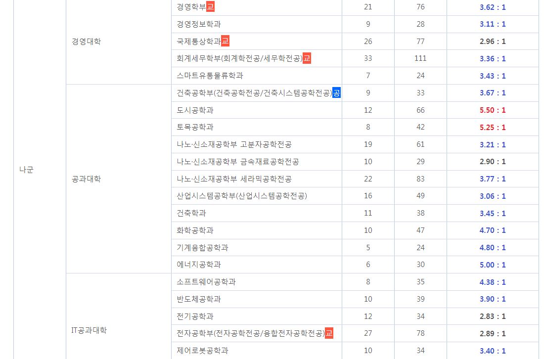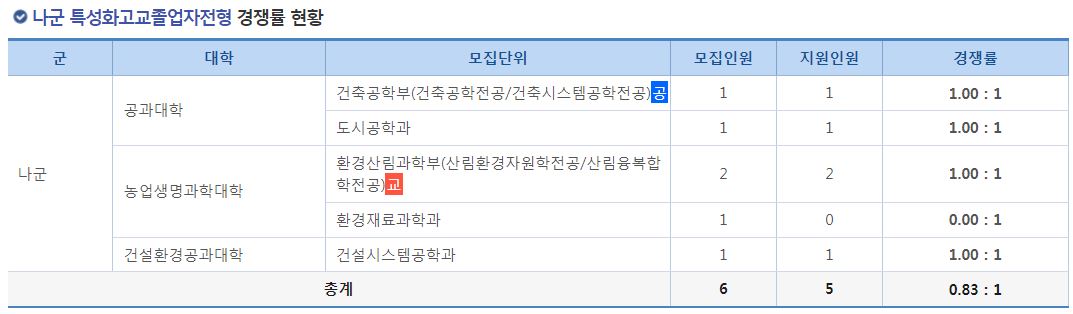 나군 특성화고교졸업자전형으로는 건축공학부(건축공학전공/건축시스템공학전공), 도시공학과, 환경산림과학부(산림환경자원학전공/산림융복합학전공), 환경재료과학과, 건설시스템공학과를 모집했으며, 환경재료과학과는 미달이었으며 나머지 학과의 모집인원과 지원인원은 같았습니다.