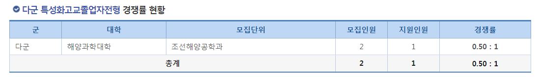 다군 특성화고교졸업자전형으로는 조선해양공학과를 모집했으며, 미달이었습니다,
