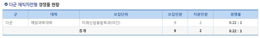 다군 재직자전형으로는 미래산업융합학과(야간)를 모집했으며, 미달이었습니다.