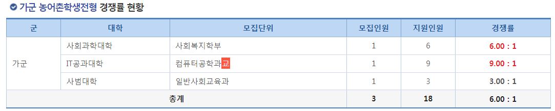 가군 농어촌학생전형으로는 사회복지학부, 컴퓨터공학과, 일반사회교육과를 모집했으며 사회복지학부의 경쟁률은 6.00:1, 컴퓨터공학과는 9.00:1, 일반사회교육과는 3.00:1 이기 때문입니다.