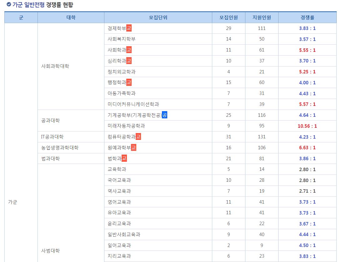 올해 경상국립대학교 가군 일반전형에서 가장 경쟁률이 높았던 약학과(12.00:1), 미래자동차공학과(10.56:1), 수의예과(10.13:1) 순이었습니다.