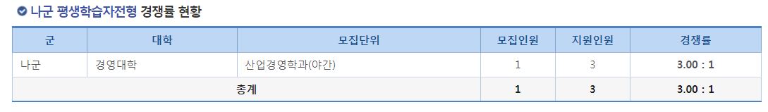 나군 평생학습자전형으로는 산업경영학과(야간)를 모집했으며, 경쟁률은 3.00:1 이었습니다.