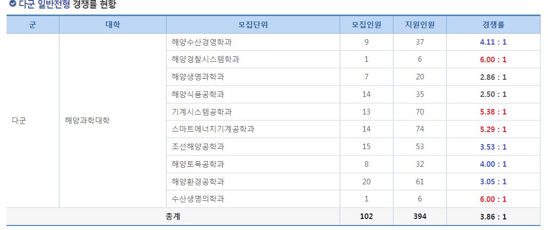 다군 일반전형에서 가장 경쟁률이 높았던 학과는 해양경찰시스템학과 6.00:1, 수산생명의학과 6.00:1, 기계시스템공학과 5.38:1 순이었습니다.