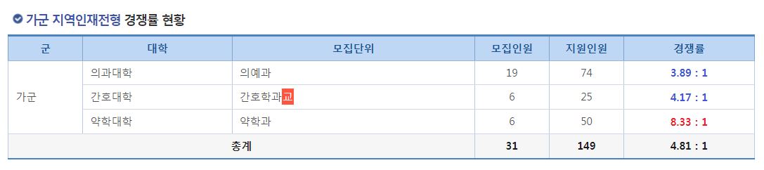 가군 지역인재전형으로는 의예과, 간호학과, 약학과를 모집했으며, 의예과의 경쟁률은 3.89:1, 간호학과는 4.17:1, 약학과는 8.33:1 이었습니다.