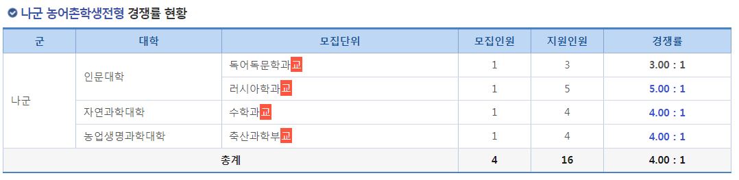 나군 농어촌학생전형으로는 독어독문학과, 러시아학과, 수학과, 축산과학부를 모집했으며, 독어독문학과의 경쟁률은 3.00:1, 러시아학과는 5.00:1, 수학과는 4.00:1, 축산과학부는 4.00:1 이었습니다.