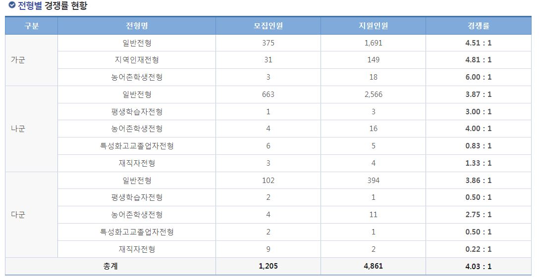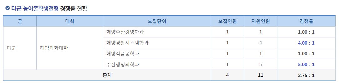 다군 농어촌학생전형의 해양수산경영학과, 해양식품공학과는 모집인원과 지원인원이 같았으며, 해양경찰시스템학과의 경쟁률은 4.00:1, 수산생명의학과 경쟁률은 5.00:1 이었습니다.