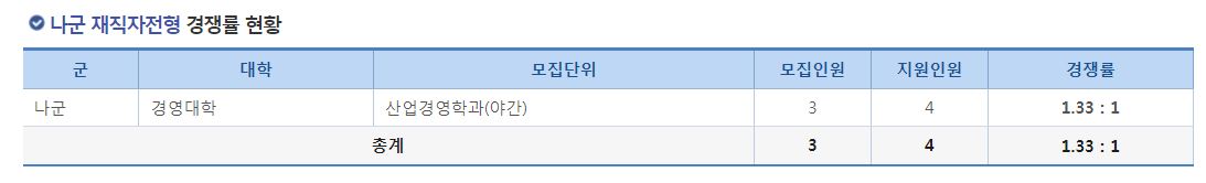나군 재직자전형으로는 산업경영학과(야간)를 모집했으며, 경쟁률은 1.33:1 이었습니다.