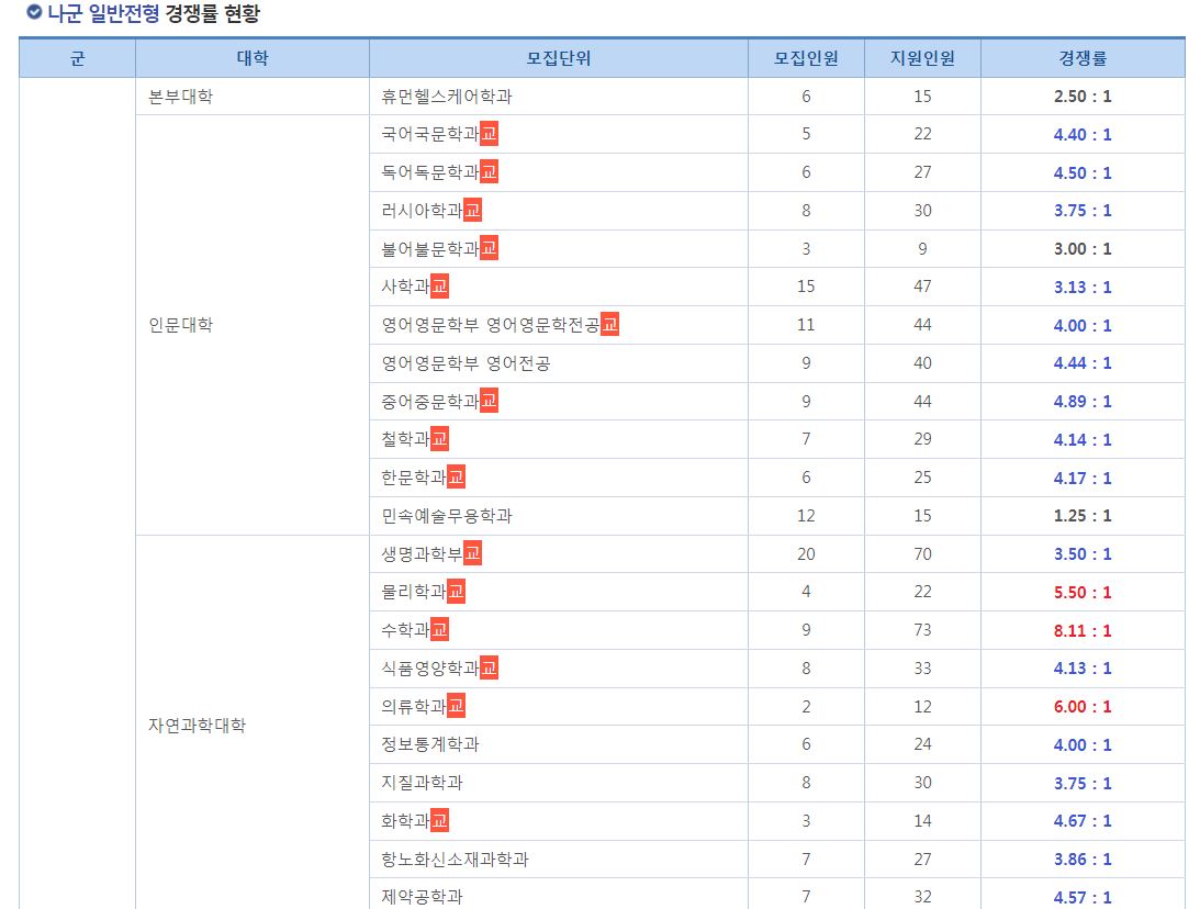 나군 일반전형에서 가장 경쟁률이 높았던 학과는 수학과(8.11:1), 환경생명화학과(6.40:1), 의류학과(6.00:1) 순이었습니다.