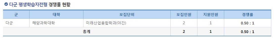 다군 평생학습자전형으로는 미래산업융합학과(야간)를 모집했으며, 미달이었습니다.