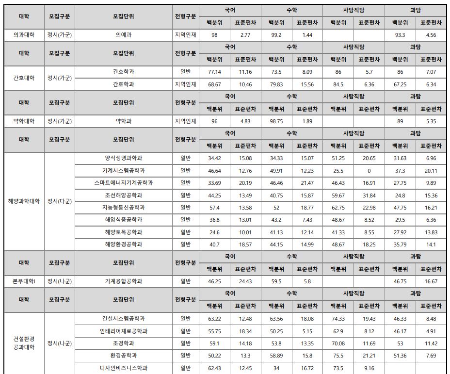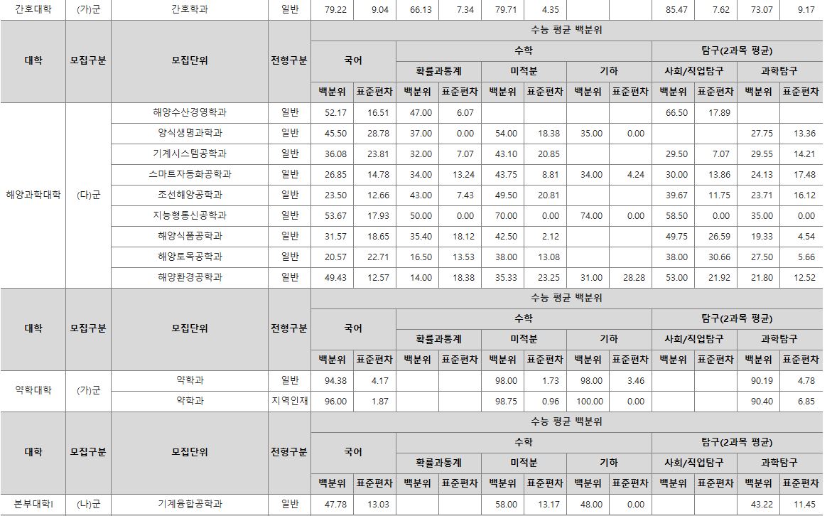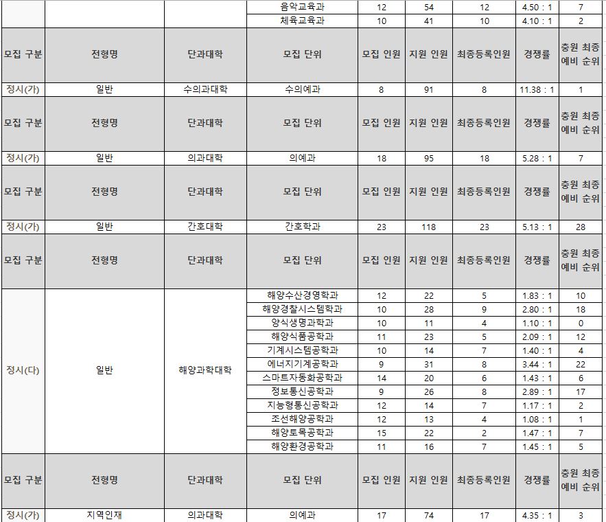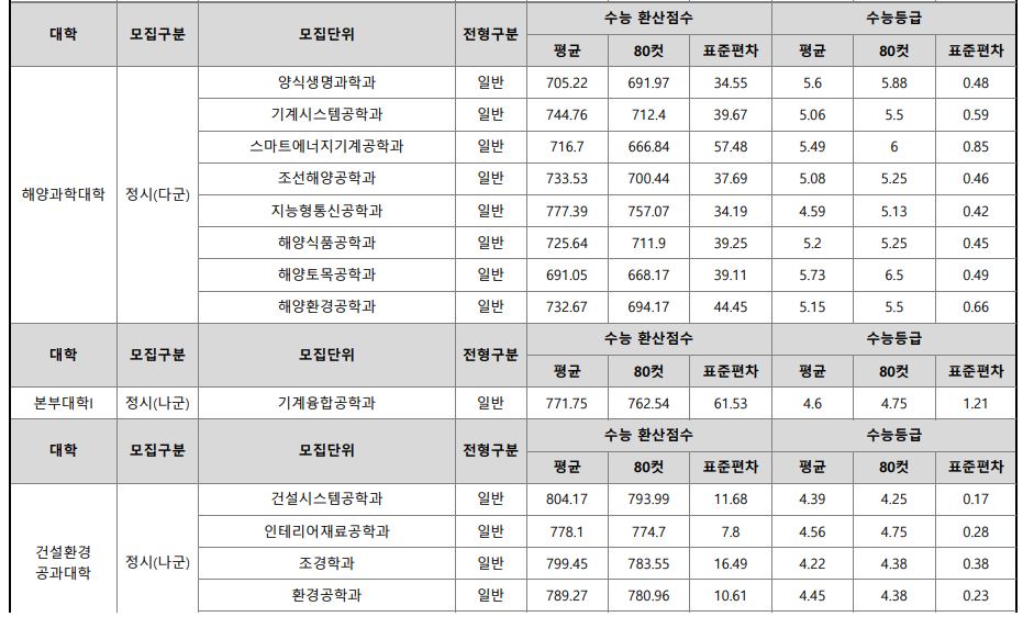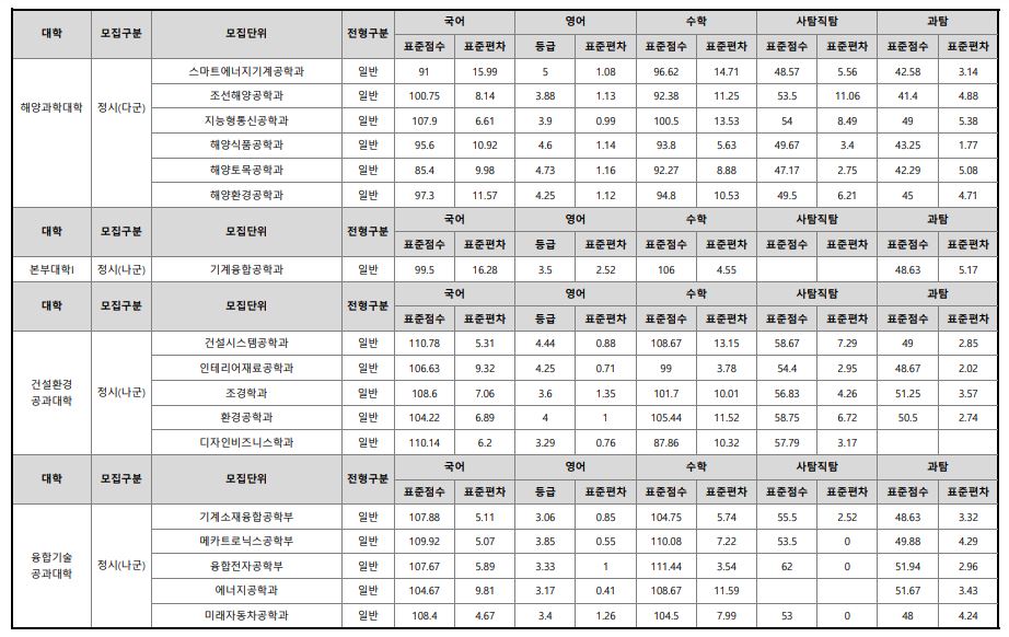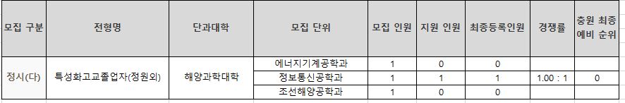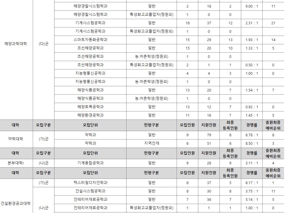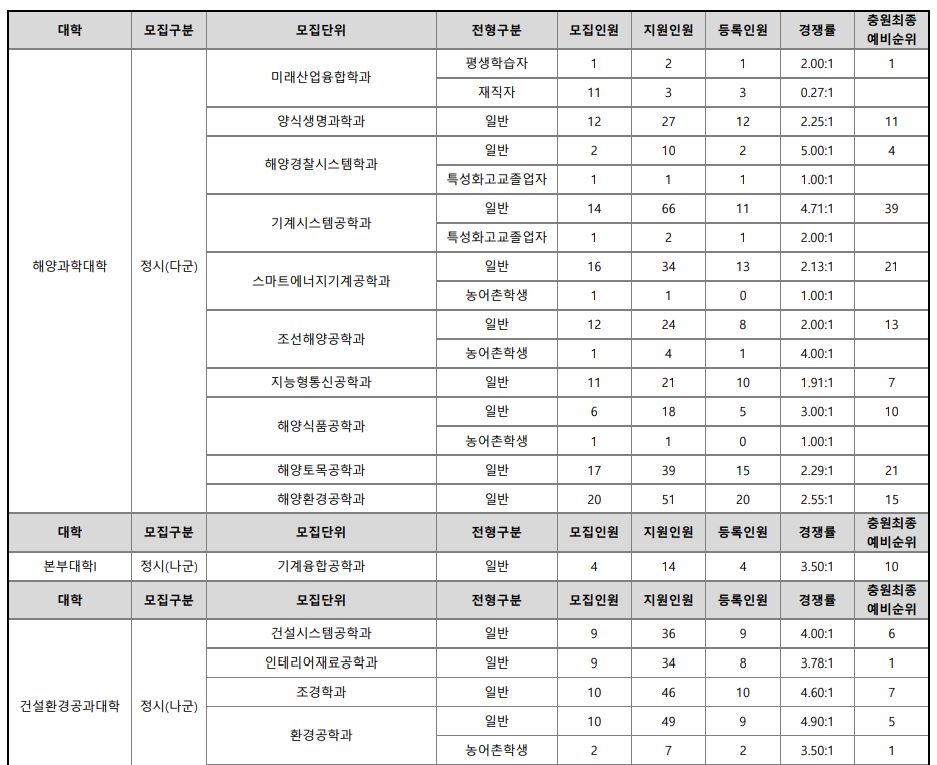 다군 : 민속무용학과, 기계공학부, 항공우주및소프트웨어공학부, 산업시스템공학부, 반도체공학과, 전기공학과, 화학공학과, 법학과, 해양수산경영학과, 해양경찰시스템학과, 양식생명과학과, 해양식품공학과, 기계시스템공학과, 에너지기계공학과, 스마트자동화공학과, 정보통신공학과, 지능형통신공학과, 조선해양공학과, 해양토목공학과, 해양환경공학과, 산업시스템공학부(정원외), 양식생명과학과(정원외), 기계시스템공학과(정원외), 정보통신공학과(정원외), 에너지기계공학과(정원외), 정보통신공학과(정원외), 조선해양공학과(정원외)