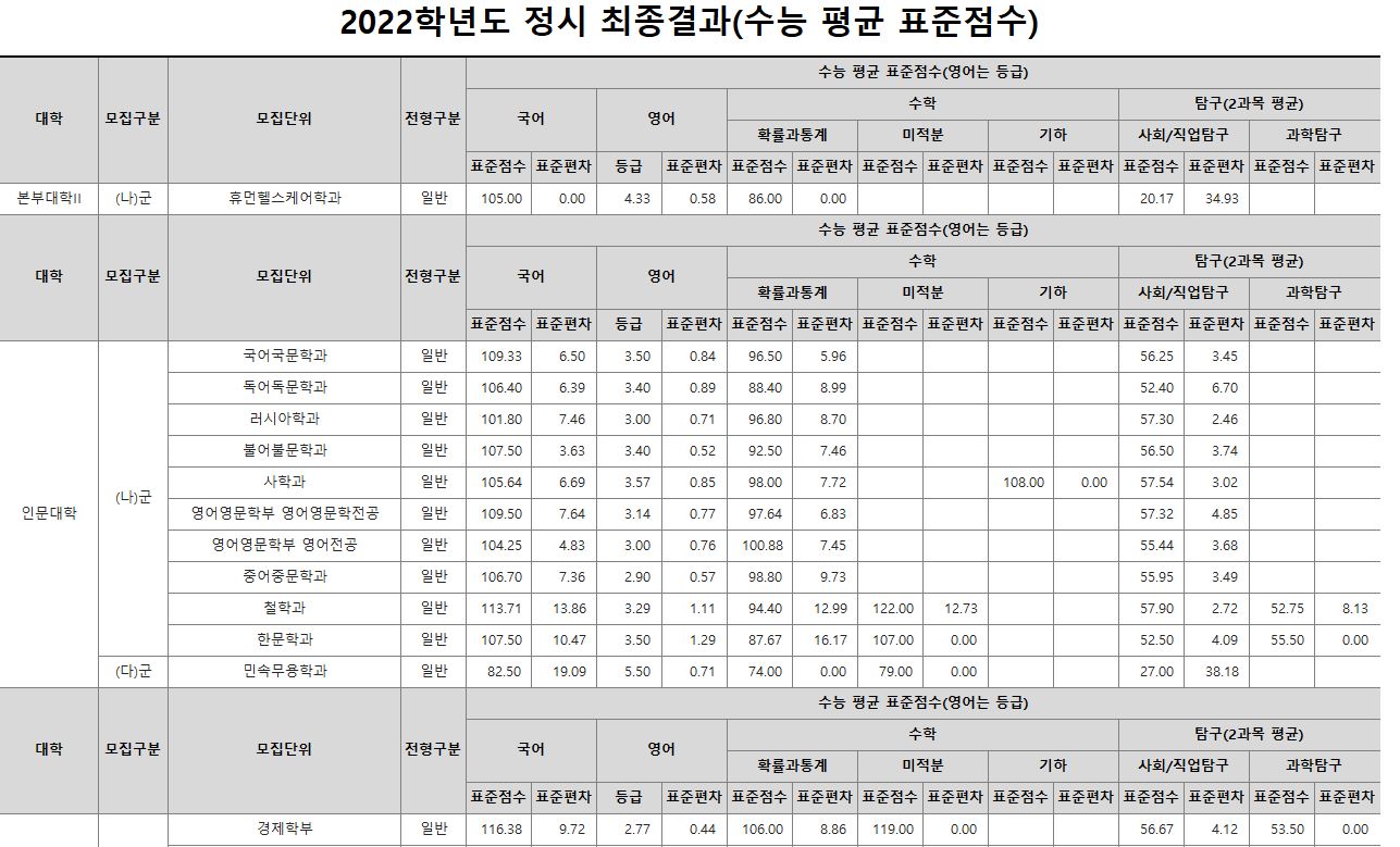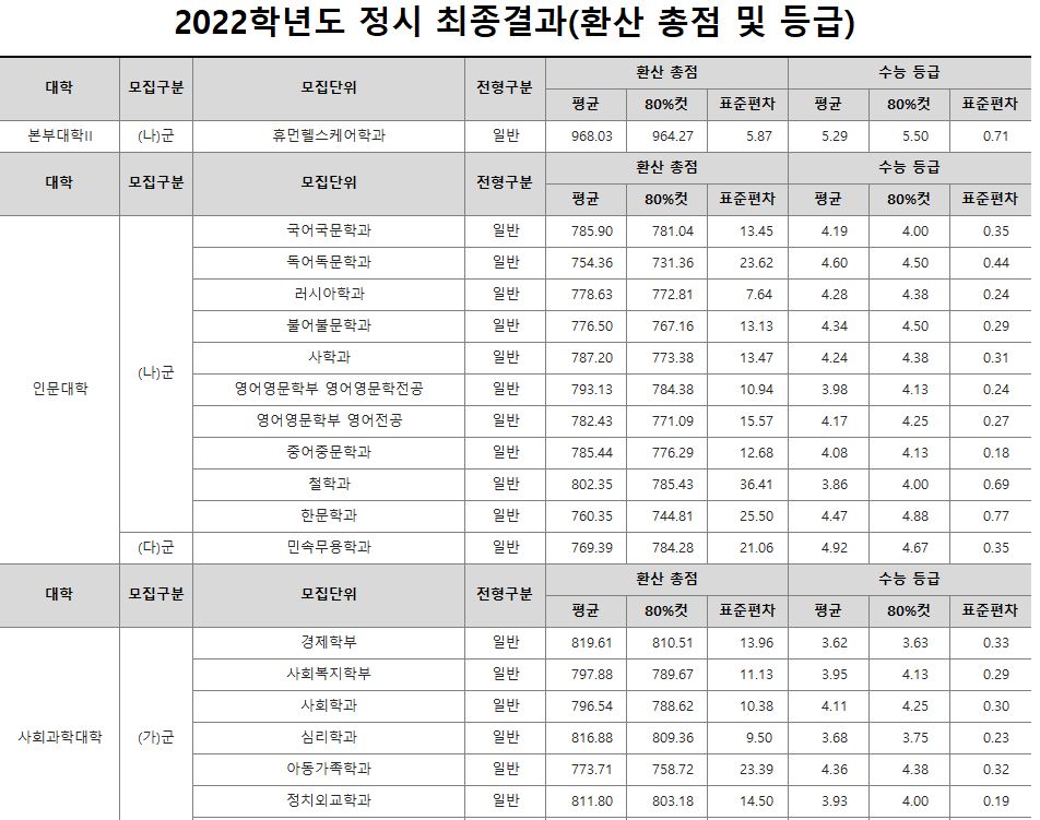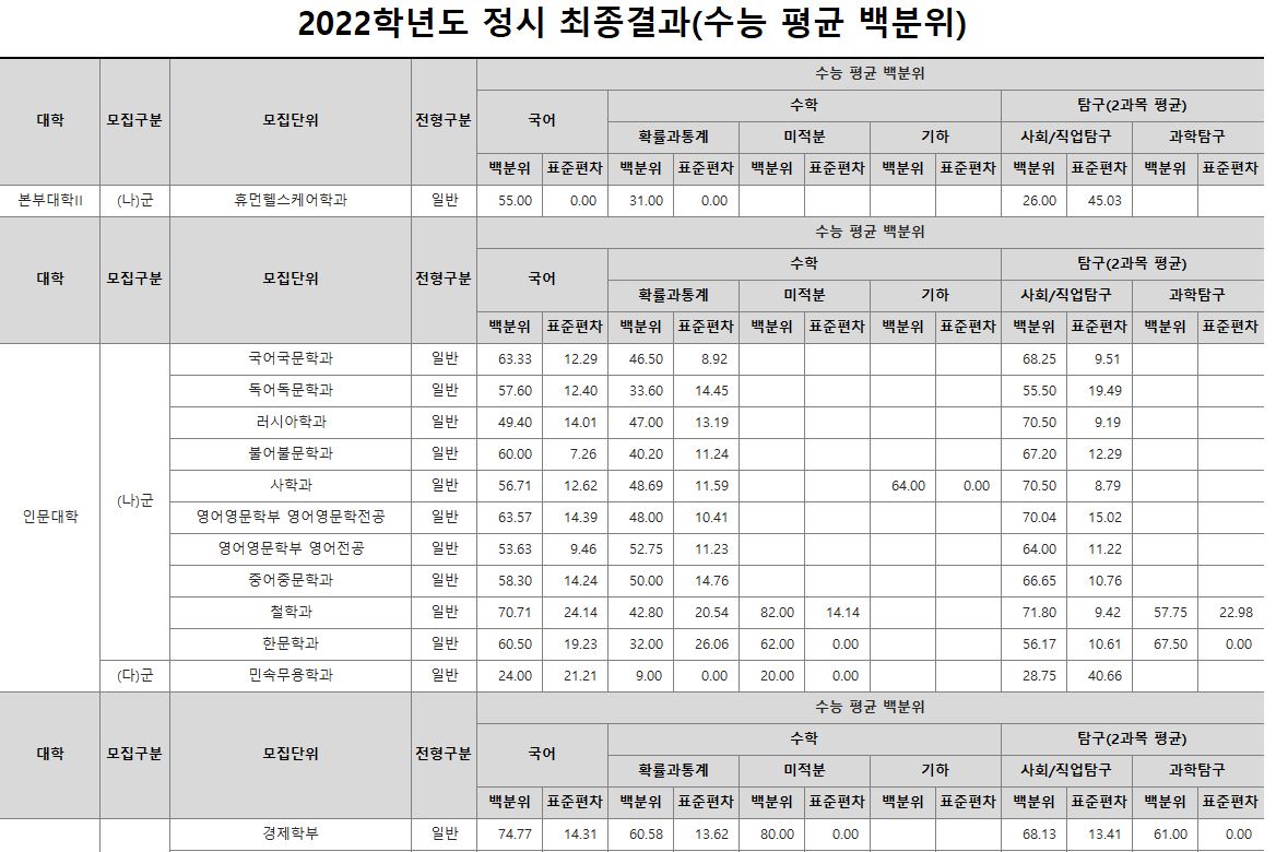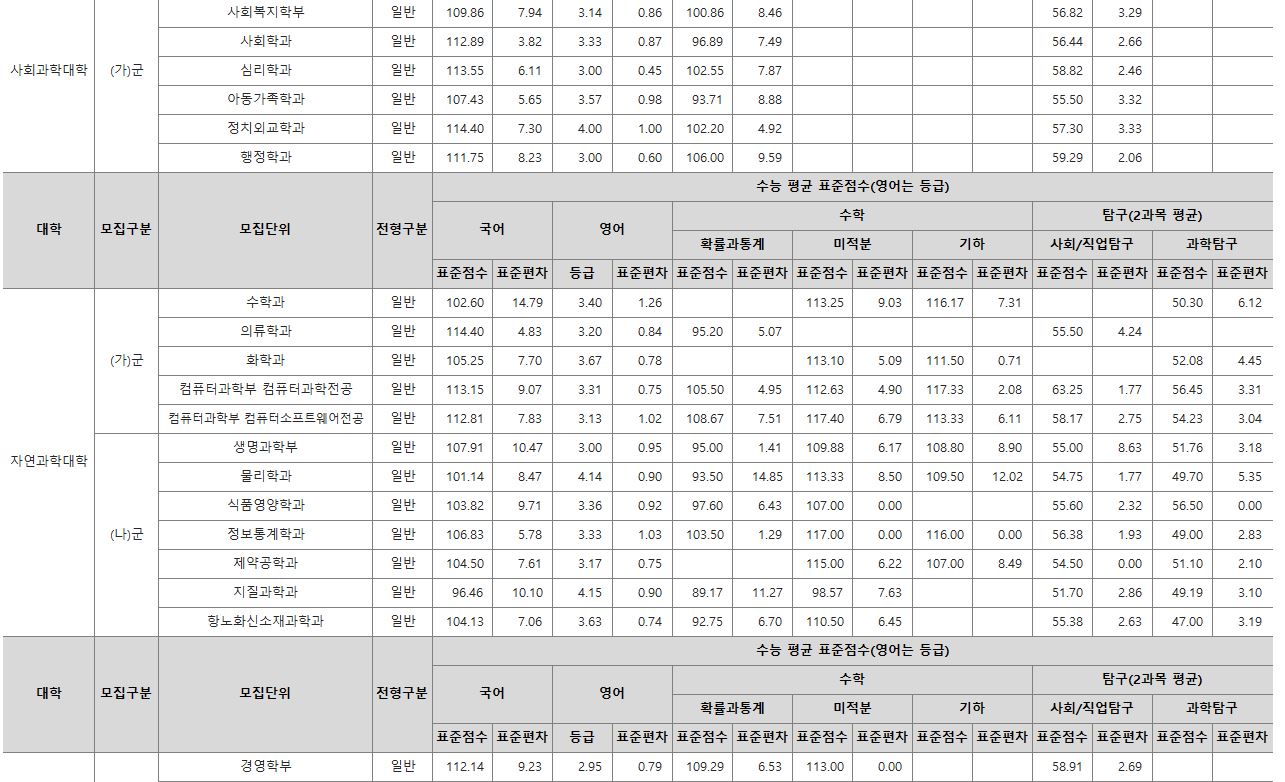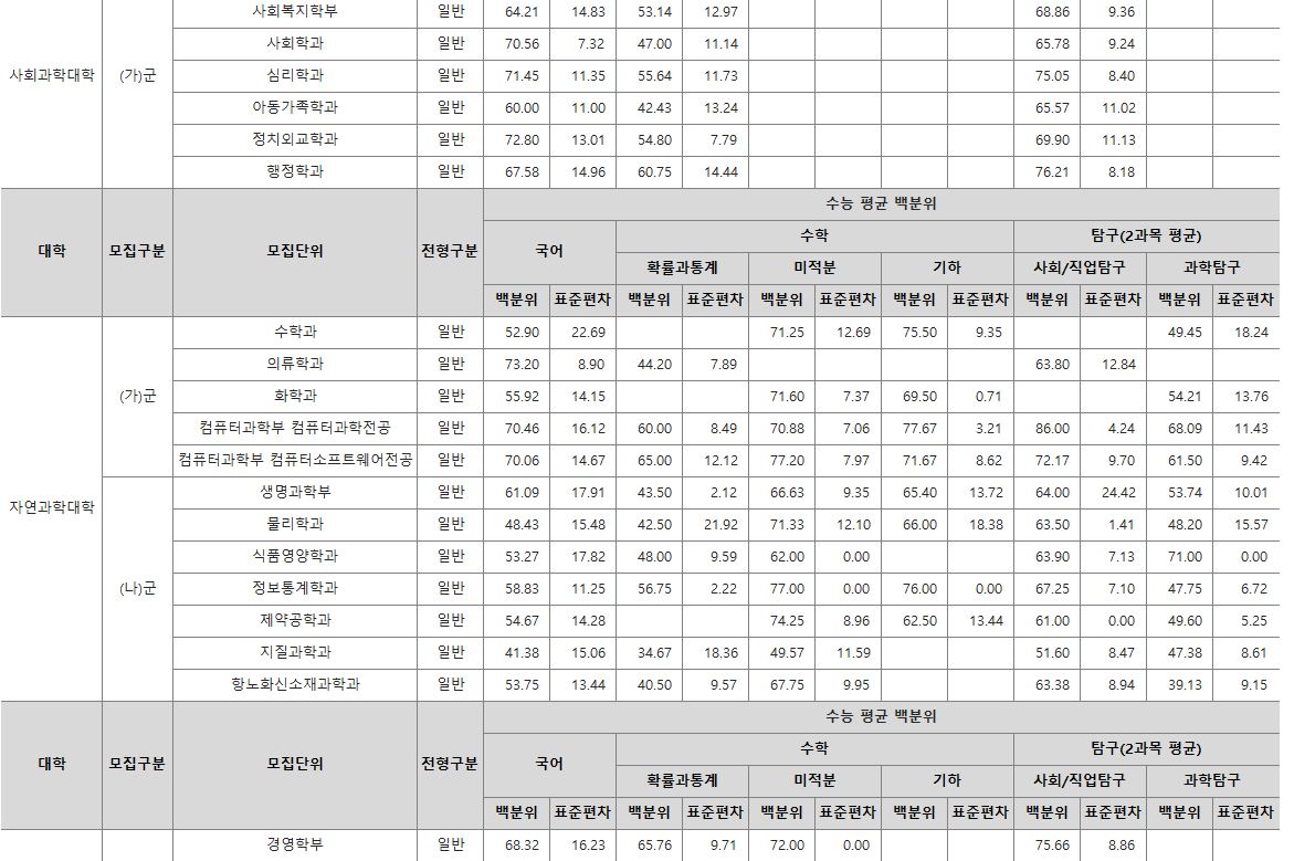 나군 : 휴먼헬스케어학과, 영어영문학부 영어영문학전공, 영어영문학부 영어전공, 국어국문학과, 독어독문학과, 러시아어학과, 불어불문학과, 사학과, 중어중문학과, 철학과, 한문학과, 생명과학부, 물리학과, 식품영양학과, 의류학과, 정보통계학과, 제약공학과, 지질과학과, 항노화신소재과학과, 경영학부, 국제통상학부, 회계세무학부, 경영정보학과, 스마트유통물류학과, 산업경영학과, 건축공학부, 나노신소재공학부 고분자공학전공, 나노신소재공학부 금속재료공학전공, 나노신소재공학부 세라믹공학전공, 산업시스템공학부, 항공우주및소프트웨어공학부, 건축학과, 도시공학과, 반도체공학과, 전기공학과, 전자공학과, 제어계측공학과, 토목공학과, 화학공학과, 식품자원경제학과, 동물생명융합학부, 식품공학부, 축산과학부, 환경산림과학부, 환경산림과학부 산림융복합학전공, 농학과, 스마트농산업학과, 식물의학과, 환경생명화학과, 환경재료과학과, 생물산업기계공학과, 지역시스템공학과, 기계융합공학과, 건설시스템공학과, 인테리어재료공학과, 조경학과, 환경공학과, 기계소재융합공학부, 메카트로닉스공학부, 융합전자공학부, 에너지공학과