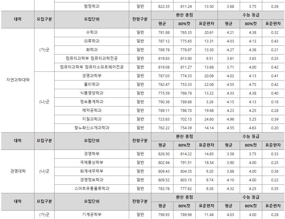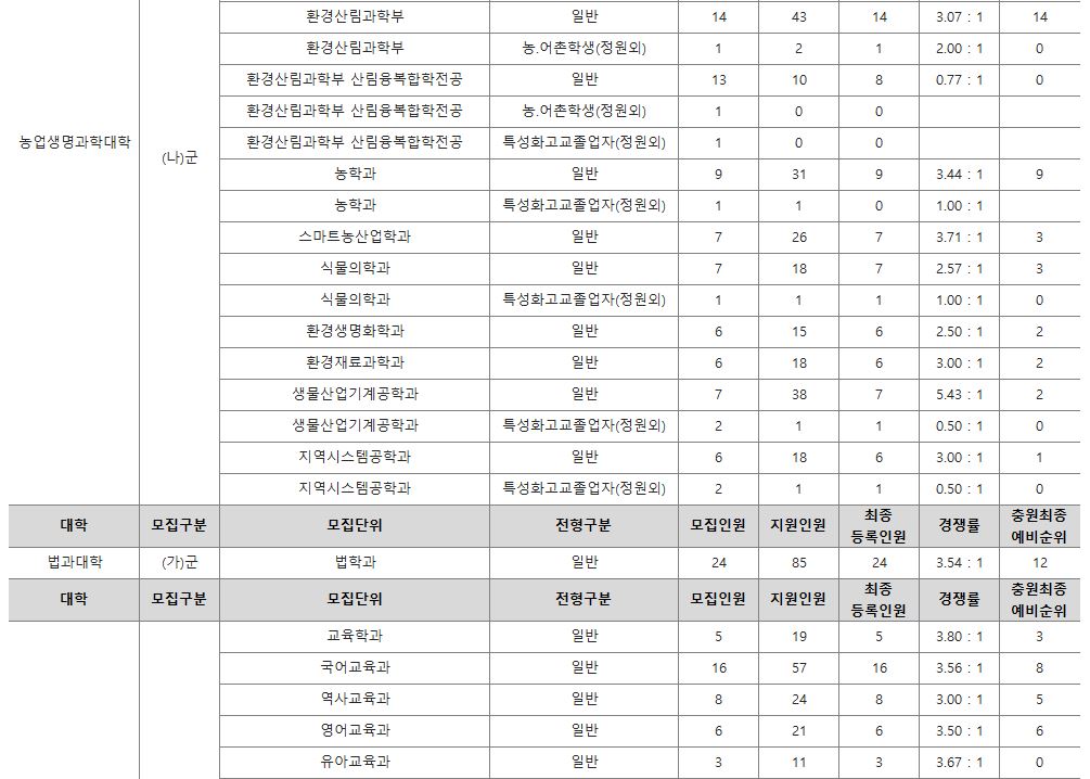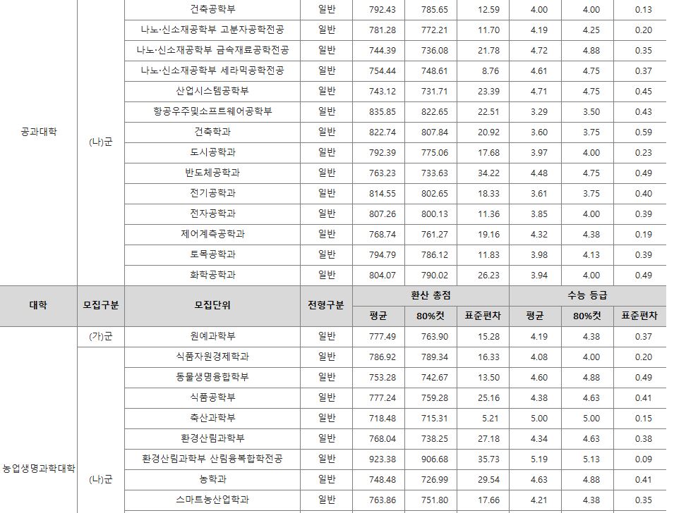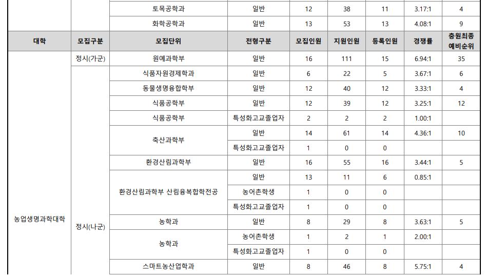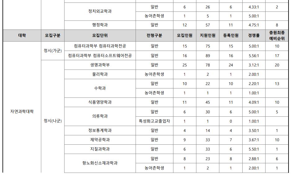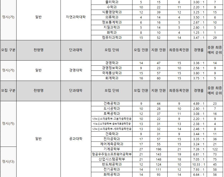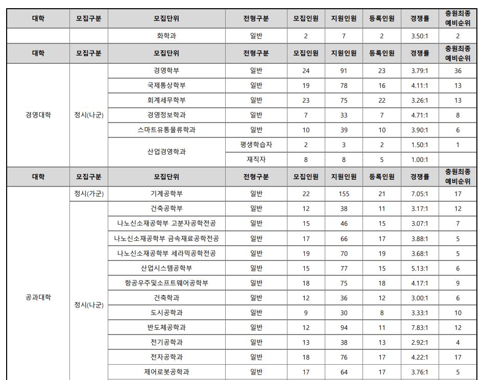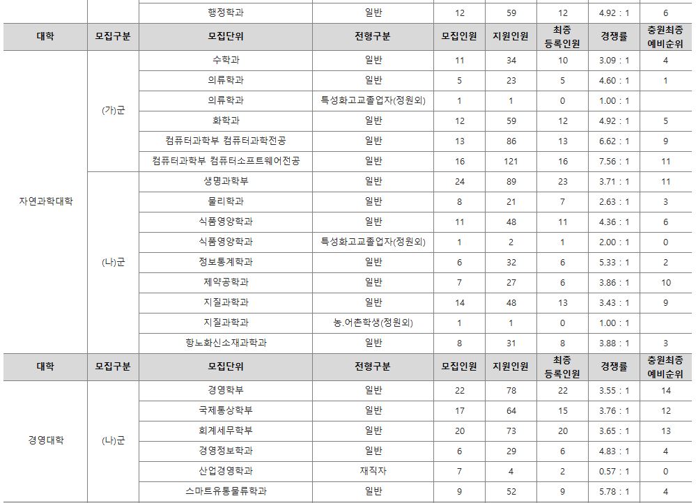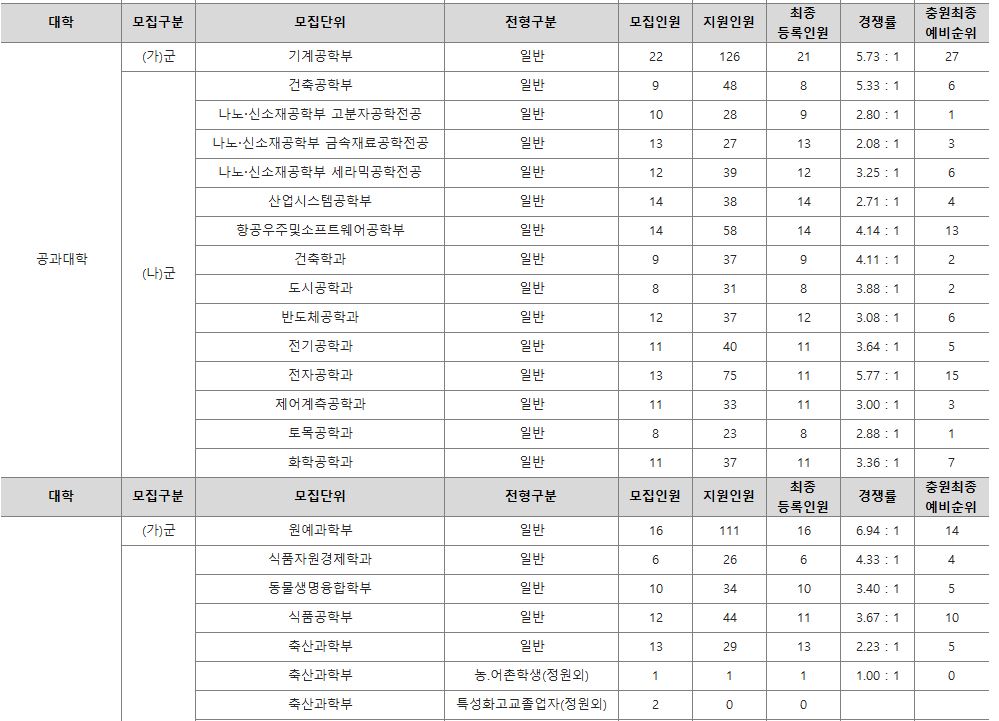 나군 : 영어영문학부 영어영문학전공, 영어영문학부 영어전공, 국어국문학과, 독어독문학과, 러시아어학과, 불어불문학과, 사학과, 중어중문학과, 철학과, 한문학과, 생명과학부, 물리학과, 수학과, 식품영양학과, 의류학과, 정보통계학과, 제약공학과, 지질과학과, 항노화신소재과학과, 화학과, 경영학부, 국제통상학부, 회계세무학부, 경영정보학과, 스마트유통물류학과, 산업경영학과, 건축공학부, 나노신소재공학부 고분자공학전공, 나노신소재공학부 금속재료공학전공, 나노신소재공학부 세라믹공학전공, 산업시스템공학부, 항공우주및소프트웨어공학부, 건축학과, 도시공학과, 반도체공학과, 전기공학과, 전자공학과, 제어로봇공학과, 토목공학과, 화학공학과, 식품자원경제학과, 동물생명융합학부, 식품공학부, 축산과학부, 환경산림과학부, 환경산림과학부 산림융복합학전공, 농학과, 스마트농산업학과, 식물의학과, 환경생명화학과, 환경재료과학과, 생물산업기계공학과, 지역시스템공학과, 기계융합공학과, 건설시스템공학과, 인테리어재료공학과, 조경학과, 환경공학과, 디자인비즈니스학과, 기계소재융합공학부, 메카트로닉스공학부, 융합전자공학부, 에너지공학과, 미래자동차공학과, 휴먼헬스케어학과