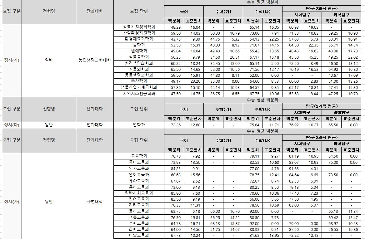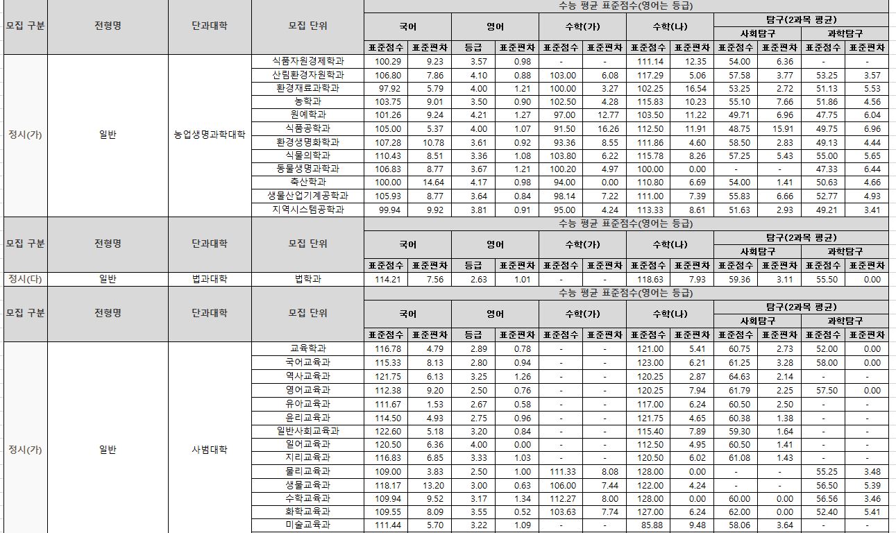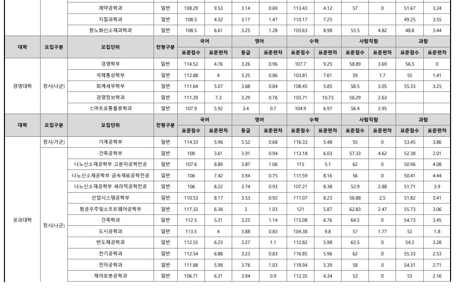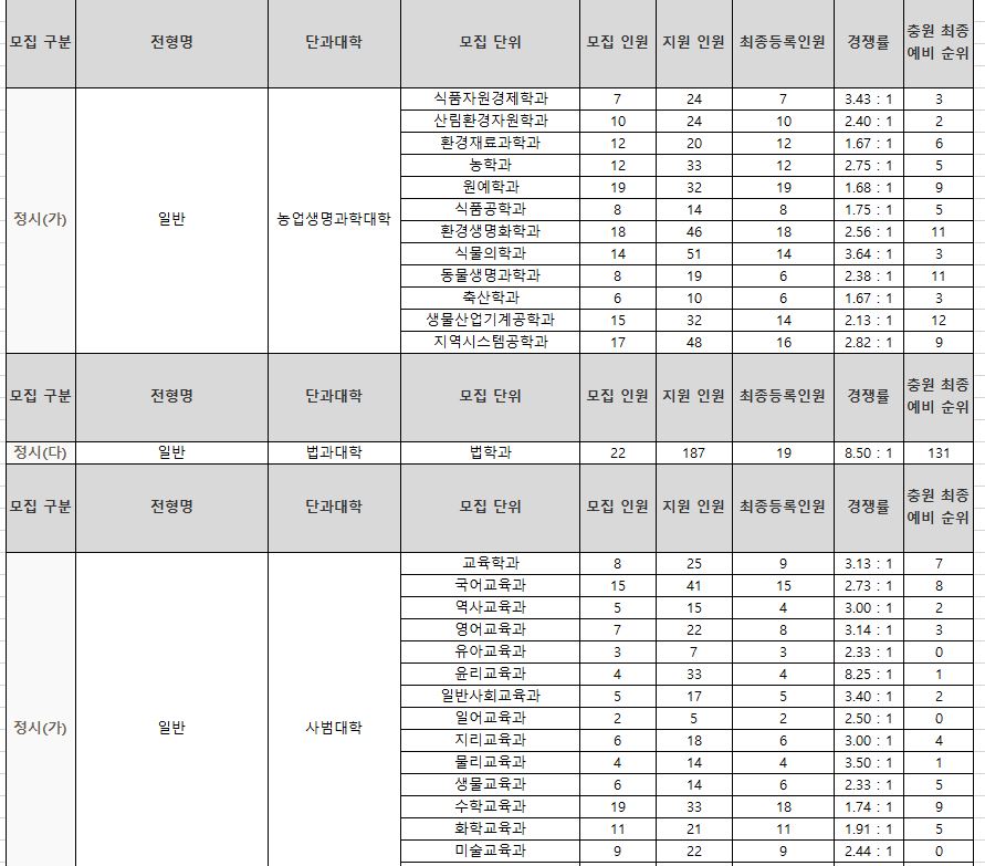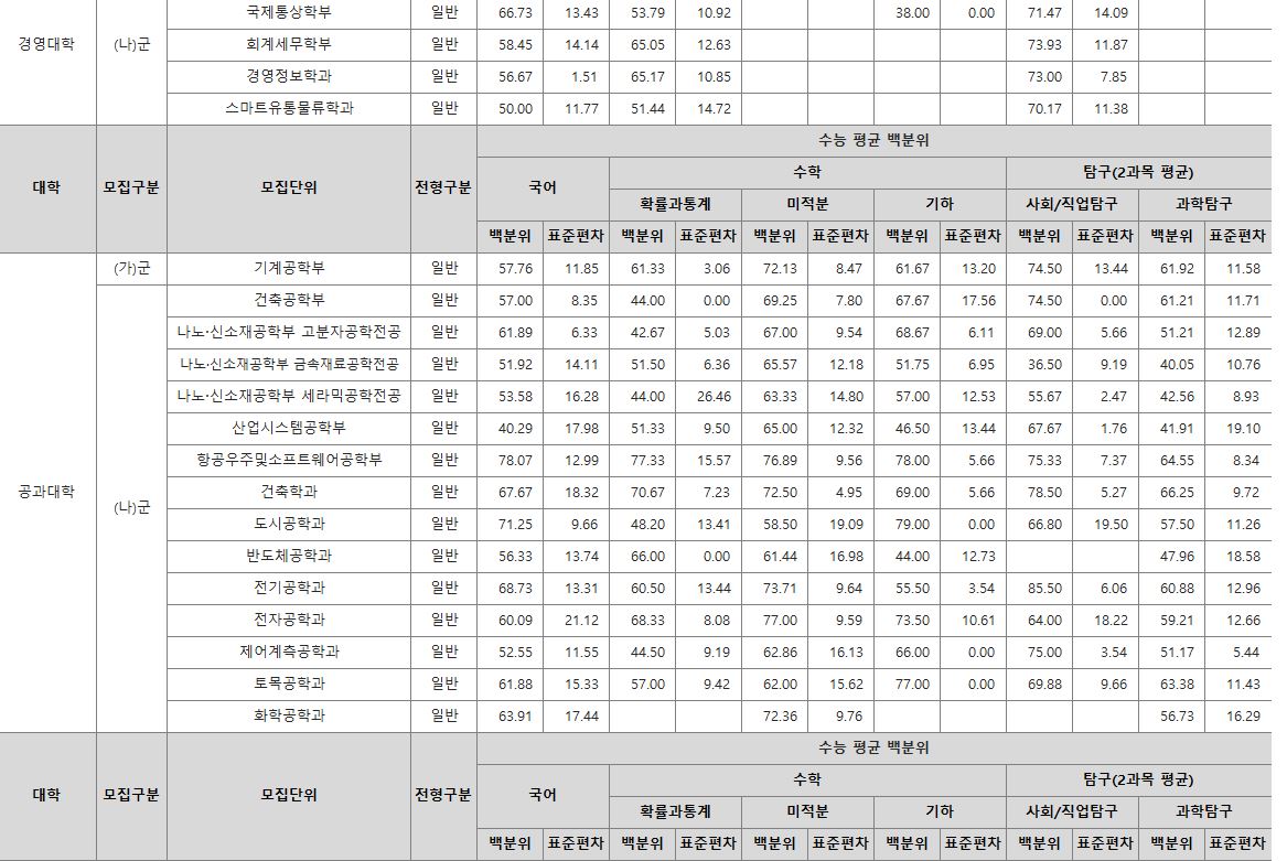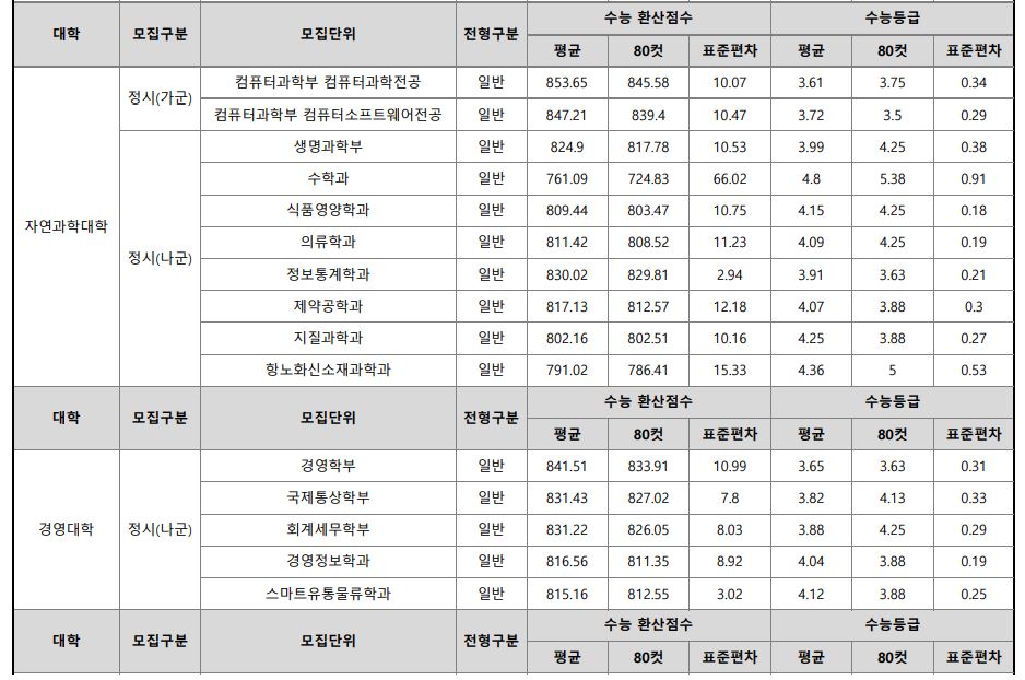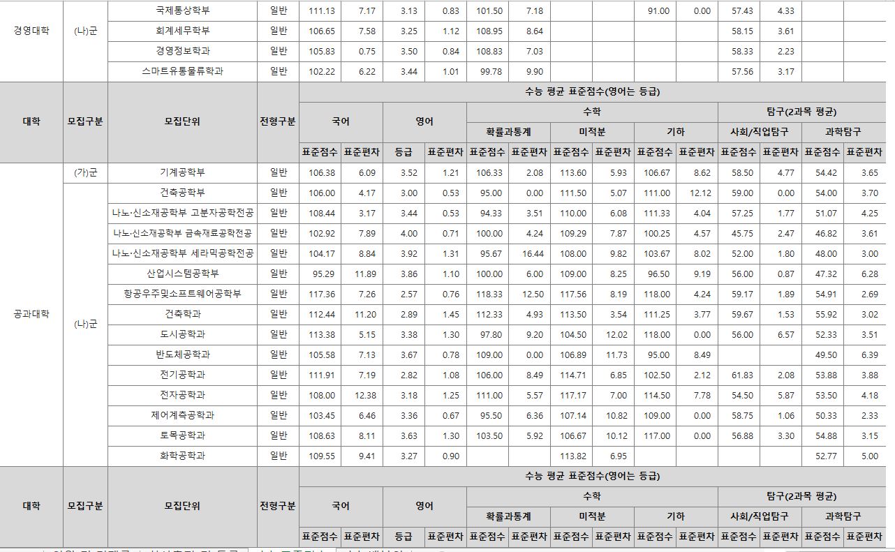 나군 : 영어영문학부 영어영문학전공, 영어영문학부 영어전공, 국어국문학과, 독어독문학과, 러시아어학과, 불어불문학과, 사학과, 중어중문학과, 철학과, 한문학과, 생명과학부, 물리학과, 수학과, 식품영양학과, 의류학과, 정보통계학과, 제약공학과, 지질과학과, 항노화신소재과학과, 화학과, 경영학부, 국제통상학부, 회계세무학부, 경영정보학과, 스마트유통물류학과, 산업경영학과, 건축공학부, 나노신소재공학부 고분자공학전공, 나노신소재공학부 금속재료공학전공, 나노신소재공학부 세라믹공학전공, 산업시스템공학부, 항공우주및소프트웨어공학부, 건축학과, 도시공학과, 반도체공학과, 전기공학과, 전자공학과, 제어로봇공학과, 토목공학과, 화학공학과, 식품자원경제학과, 동물생명융합학부, 식품공학부, 축산과학부, 환경산림과학부, 환경산림과학부 산림융복합학전공, 농학과, 스마트농산업학과, 식물의학과, 환경생명화학과, 환경재료과학과, 생물산업기계공학과, 지역시스템공학과, 기계융합공학과, 건설시스템공학과, 인테리어재료공학과, 조경학과, 환경공학과, 디자인비즈니스학과, 기계소재융합공학부, 메카트로닉스공학부, 융합전자공학부, 에너지공학과, 미래자동차공학과, 휴먼헬스케어학과