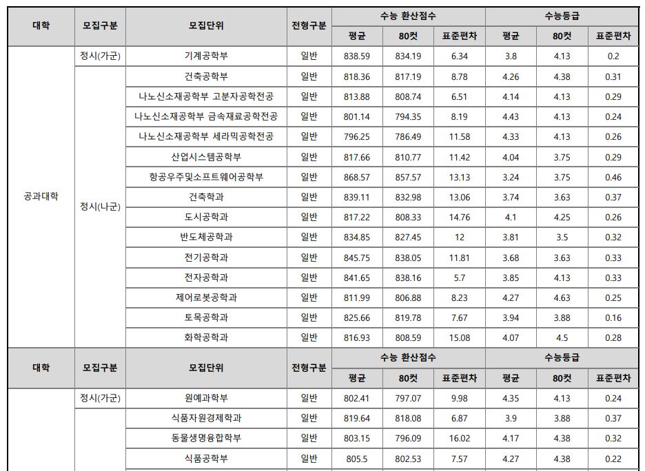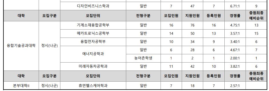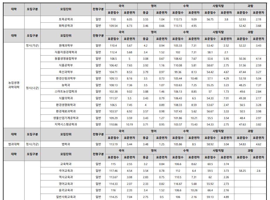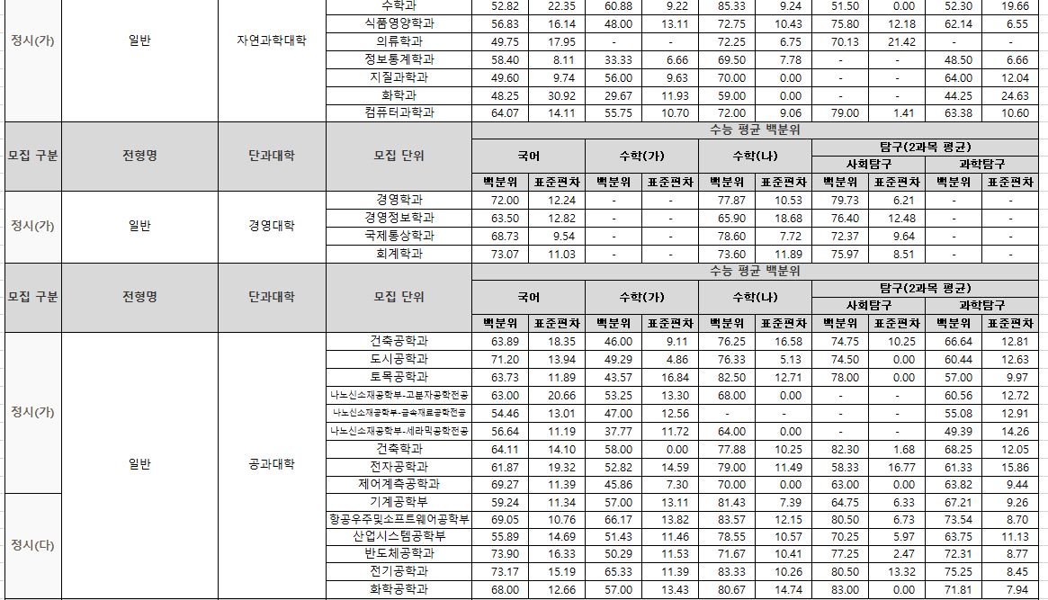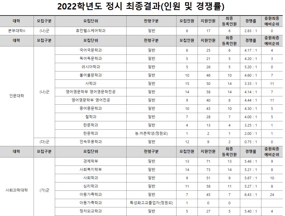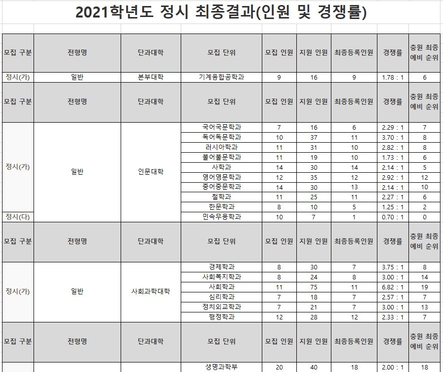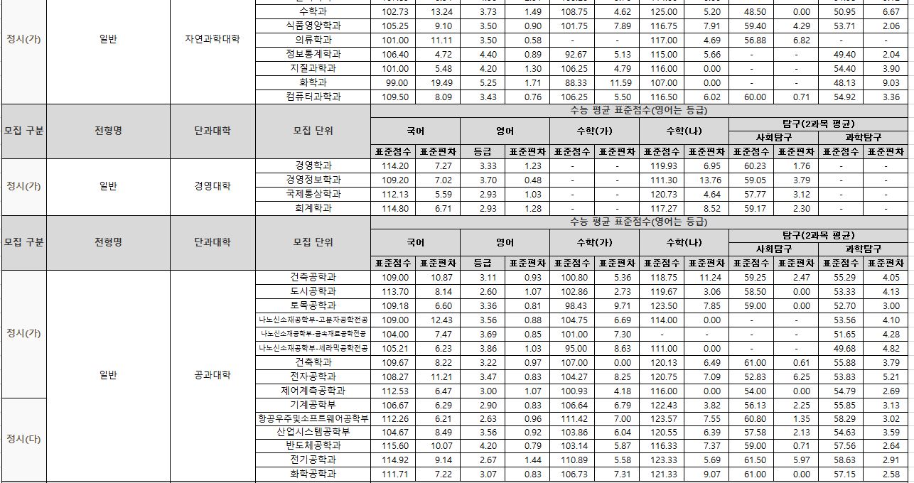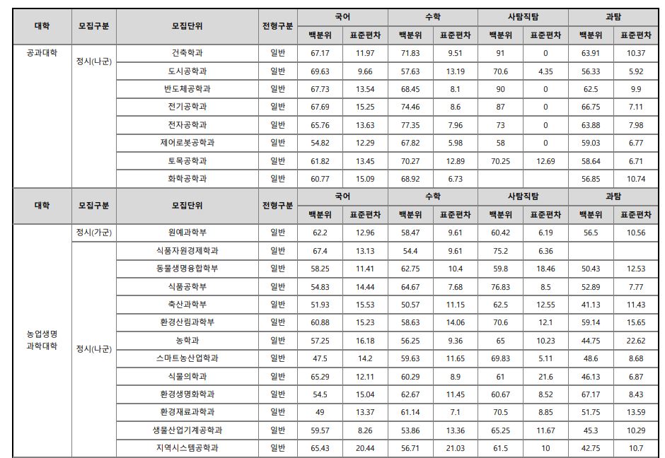 나군 : 영어영문학부 영어영문학전공, 영어영문학부 영어전공, 국어국문학과, 독어독문학과, 러시아어학과, 불어불문학과, 사학과, 중어중문학과, 철학과, 한문학과, 생명과학부, 물리학과, 수학과, 식품영양학과, 의류학과, 정보통계학과, 제약공학과, 지질과학과, 항노화신소재과학과, 화학과, 경영학부, 국제통상학부, 회계세무학부, 경영정보학과, 스마트유통물류학과, 산업경영학과, 건축공학부, 나노신소재공학부 고분자공학전공, 나노신소재공학부 금속재료공학전공, 나노신소재공학부 세라믹공학전공, 산업시스템공학부, 항공우주및소프트웨어공학부, 건축학과, 도시공학과, 반도체공학과, 전기공학과, 전자공학과, 제어로봇공학과, 토목공학과, 화학공학과, 식품자원경제학과, 동물생명융합학부, 식품공학부, 축산과학부, 환경산림과학부, 환경산림과학부 산림융복합학전공, 농학과, 스마트농산업학과, 식물의학과, 환경생명화학과, 환경재료과학과, 생물산업기계공학과, 지역시스템공학과, 기계융합공학과, 건설시스템공학과, 인테리어재료공학과, 조경학과, 환경공학과, 디자인비즈니스학과, 기계소재융합공학부, 메카트로닉스공학부, 융합전자공학부, 에너지공학과, 미래자동차공학과, 휴먼헬스케어학과